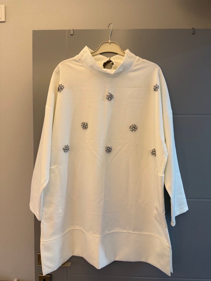Pamuk kumaştan, uzun kollu, bisiklet yaka ve bol kesim beyaz kadın tunik. Taş işleme detayları ve düğmelerle süslenmiş, günlük rahat stil için midi boyda. Hiç kullanılmamıştır. Bol kesimdir.