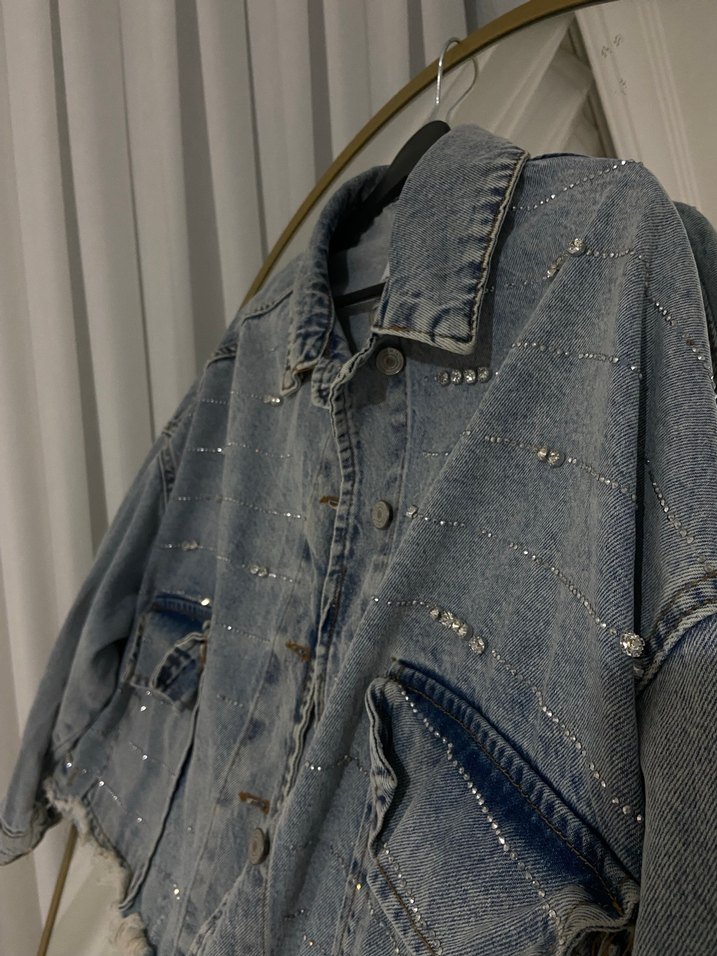 Taş işlemeli, düğmeli kısa kot ceket, geniş kesim ve kesik yakaya sahiptir. Sokak stiline uygun şık bir tasarımdır. ✨
