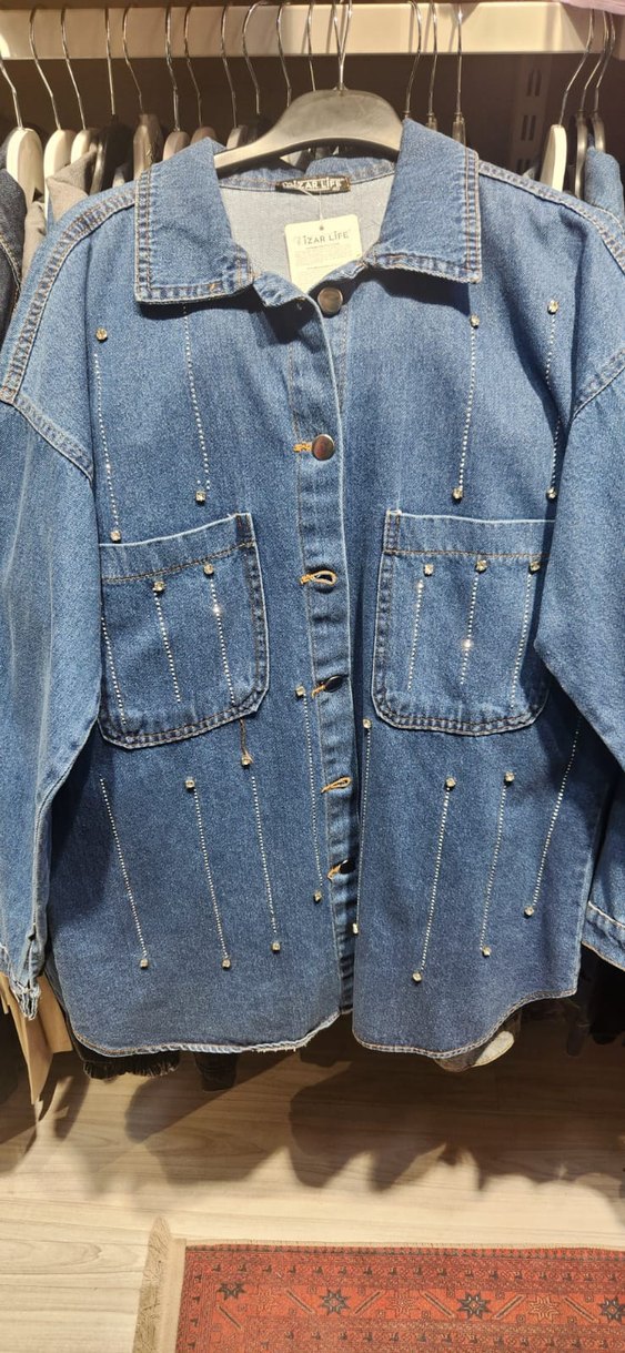 Düğmeli, notalı yakalı, taş işlemeli mavi denim ceket. Bol kesim, uzun kollu ve büyük ön ceplidir. Günlük kullanıma uygundur.