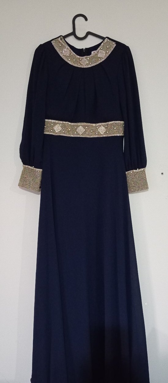 Lacivert uzun abiye elbise, tekne yaka ve uzun kolludur. Boncuk işlemeli, vintage tarzda, bel ve kol manşetlerinde parlak detaylar bulunur. 42 bedenede uyumlu ,fiyatta yardımcı olurum yazmanız yeterli