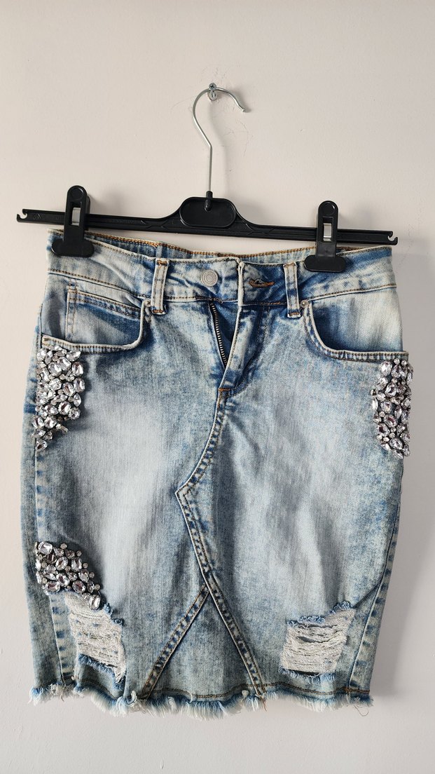 Mavi kot kumaştan, taş işlemeli ve yirtik detaylı, dar kesim likralj mini etek. spor şıklık sevenler için.