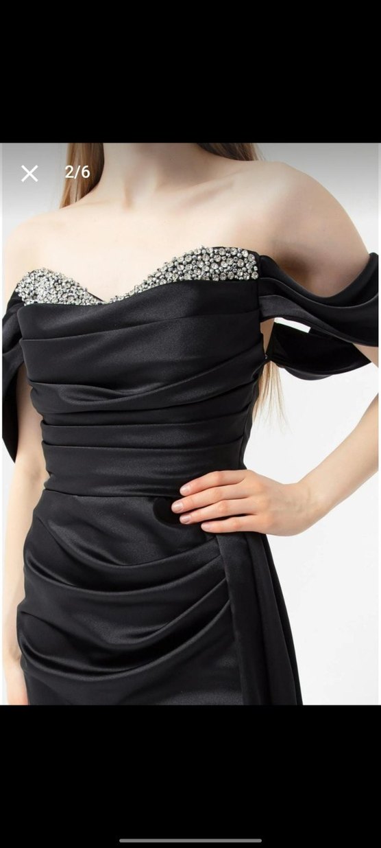 Taş işlemeli ve dökümlü detaylara sahip, kayık yaka ve ince askılı siyah uzun abiye elbise. Parlak dokusu düğünler için uygun. ✨
