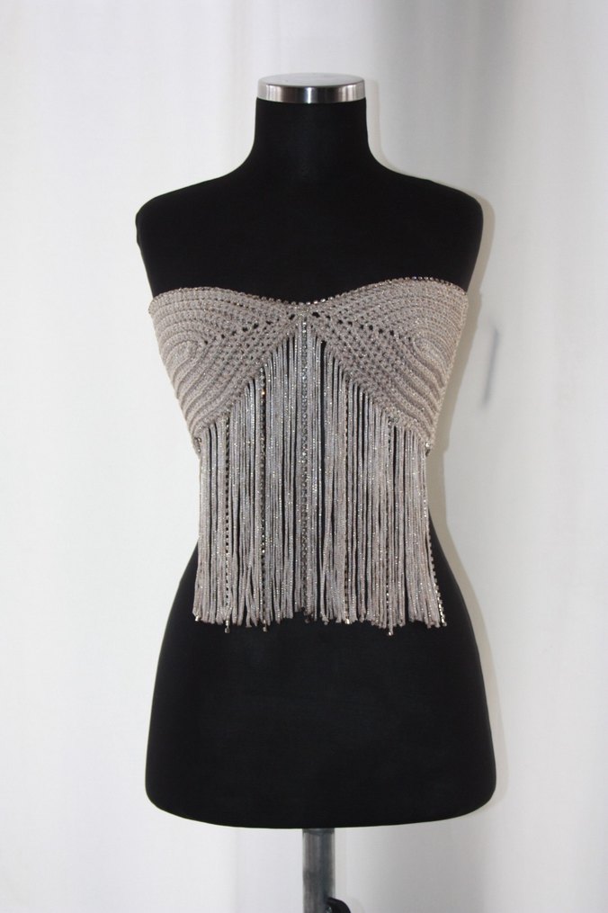 Taş işlemeli, straplez yaka, nakış detaylı kısa ve vücuda oturan triko büstiyer. Parti için ideal bir seçim. El Örgüsüdür. instagram chaincena