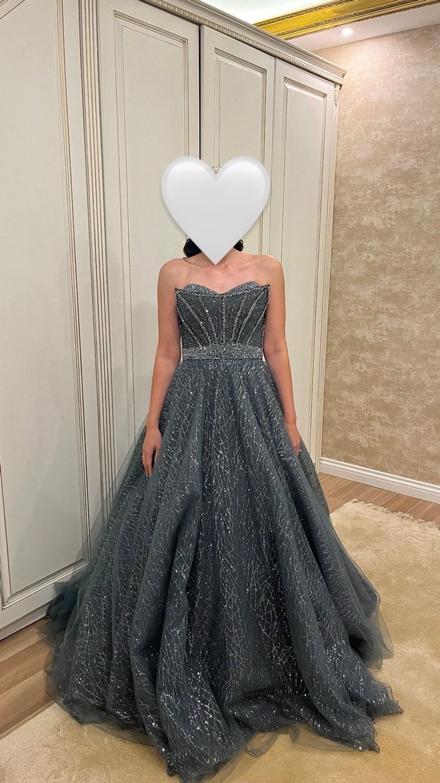 Taş işlemeli, straplez ve uzun gri nişan elbisesi. Klasik zarafeti yansıtan modern kesimi ve kolsuz tasarımıyla şık bir görünüm sunar. Arkası ipli olduğu için 38-40 beden ayarlanabilmektedir. Bir kez giyildi hiçbir yerinde sorun yoktur pazarlık yapılır