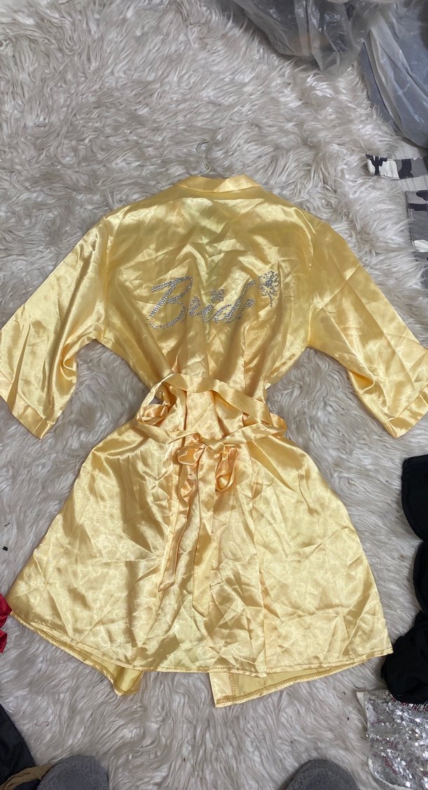 Parlak altın kumaştan, uzun kollu, bol kesim kadın sabahlık. Nakış detayları ve bağlamalı tasarımıyla bohem ve rahat bir stil sunar. ✨