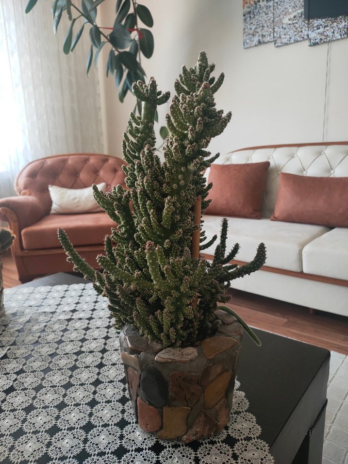 Kahverengi ve gri tonlarda taş kaplı saksıda kaktüs bitkisi, ev dekorasyonuna doğal bir dokunuş katıyor.