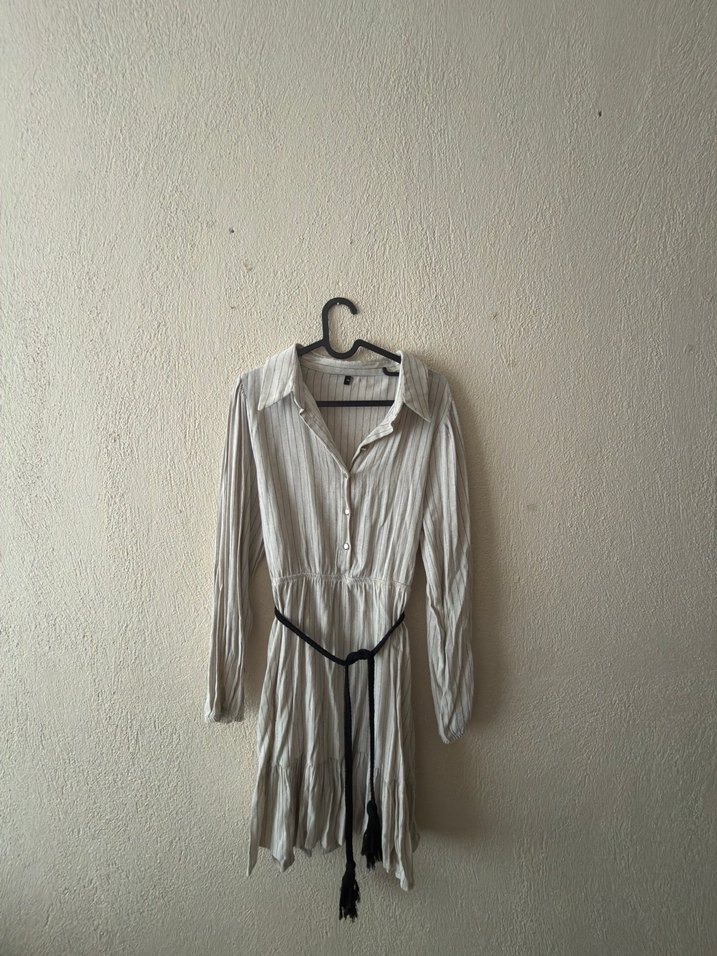 Gri midi hiç giyilmemiştir. Bej renkli, çizgili desenli gömlek elbise; düğmeli yapıya sahip olup giy-çık kullanım için oldukça pratiktir. Dokuma kumaştan üretilmiş, keten görünümlü ve %100 polyester materyale sahiptir. Astarsızdır, hafif ve rahattır. Skater kalıbı sayesinde belden oturup aşağı doğru dökümlü durur. Kısa/mini boydadır. Gömlek yaka, uzun ve standart kol detayı bulunur. Günlük/casual kullanıma uygundur, boy, bol kesim uzun kollu elbise. Minimalist, bohem tarzda, siyah kemerle şekillendirilebilir.