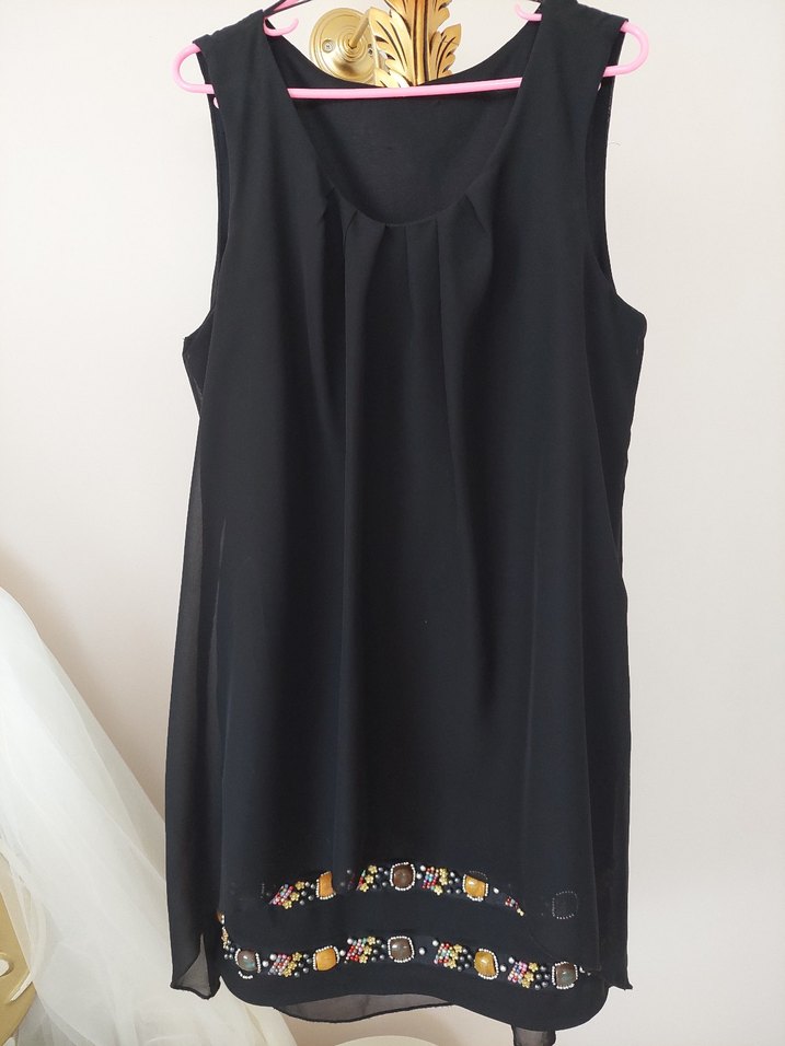 Drapeli, nakışlı detaylara sahip siyah, saten dokulu, kolsuz, Günlük kullanıma uygun bohem tarz.