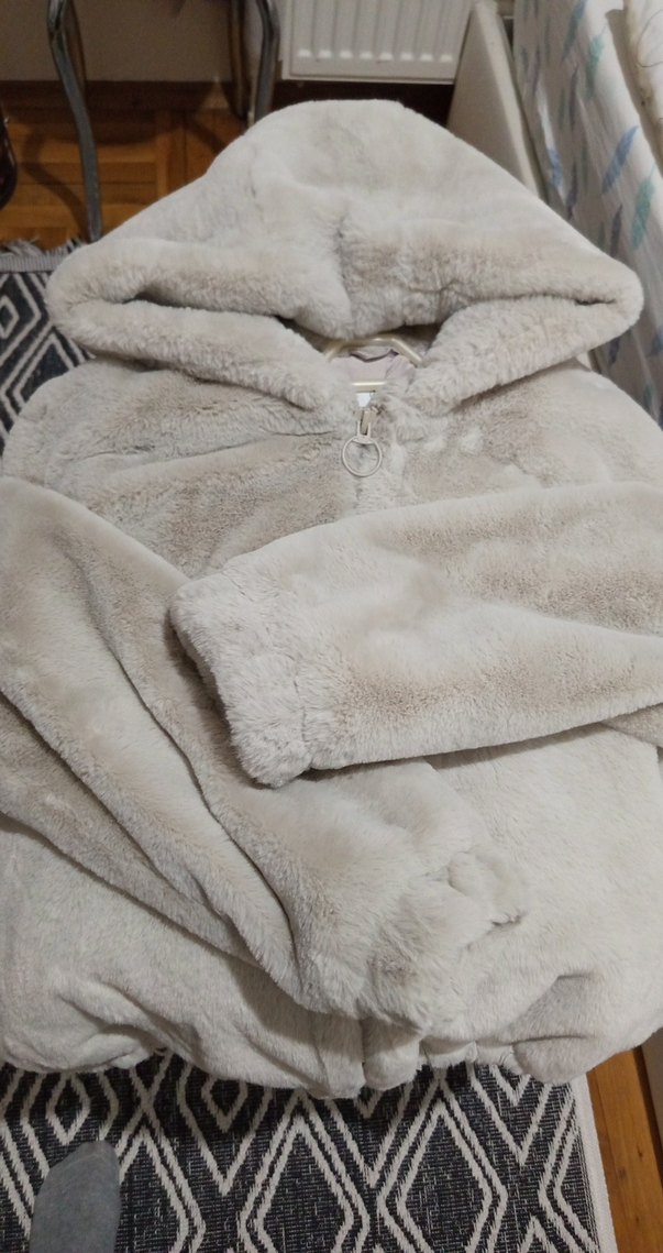 Taş rengi kapüşonlu mont, yumuşak ve peluş dokulu, bol kesim ve uzun kollu, günlük rahat kullanım için uygundur. 1 kez giyildi