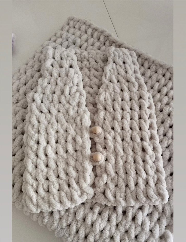 Taş rengi örgü bebek yeleği, kalın örgü deseni ve iki ahşap düğme ile yumuşak, rahat bir doku sunar.