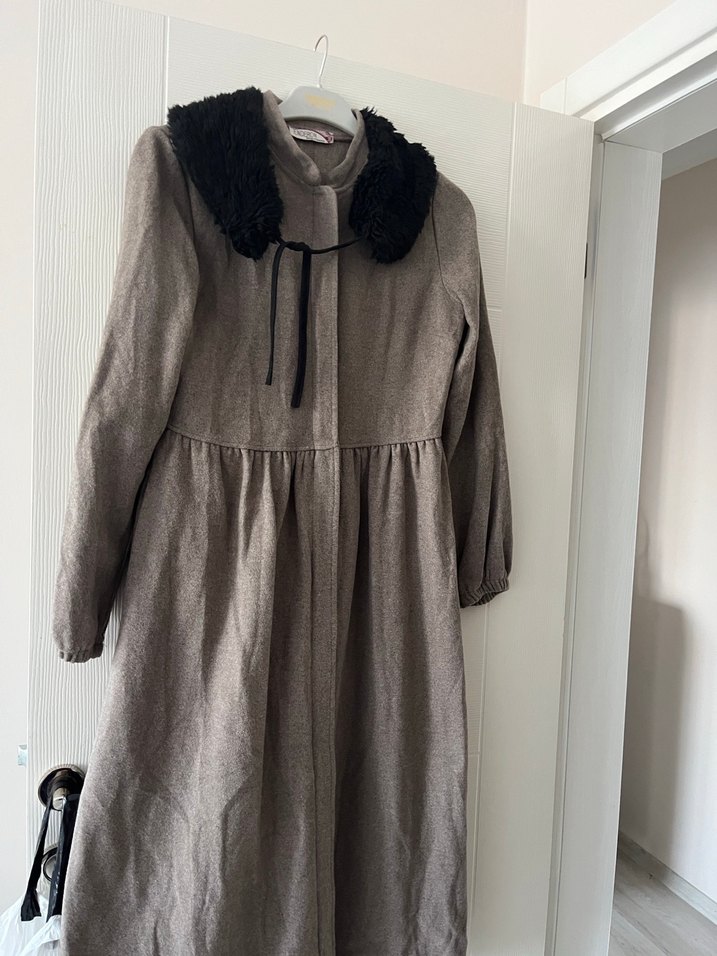 Uzun, bol kesim kadın keçe kumaş kaban, yakasında konforlu kürk detayı çıkarılabilir. Gri taş rengi tonlarında, astarsız günlük kullanıma uygun.