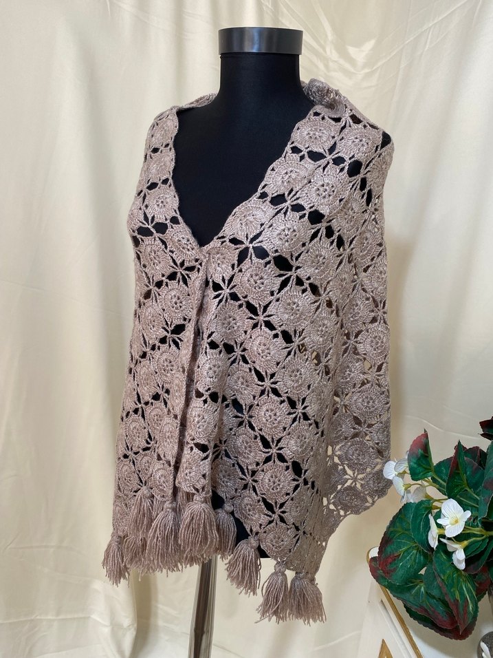 Taş renkli, simli iplerle örülmüş dantelli ve püsküllü triko kadın şal. Bohem tarzıyla retro ve hippie görünüme uygundur.