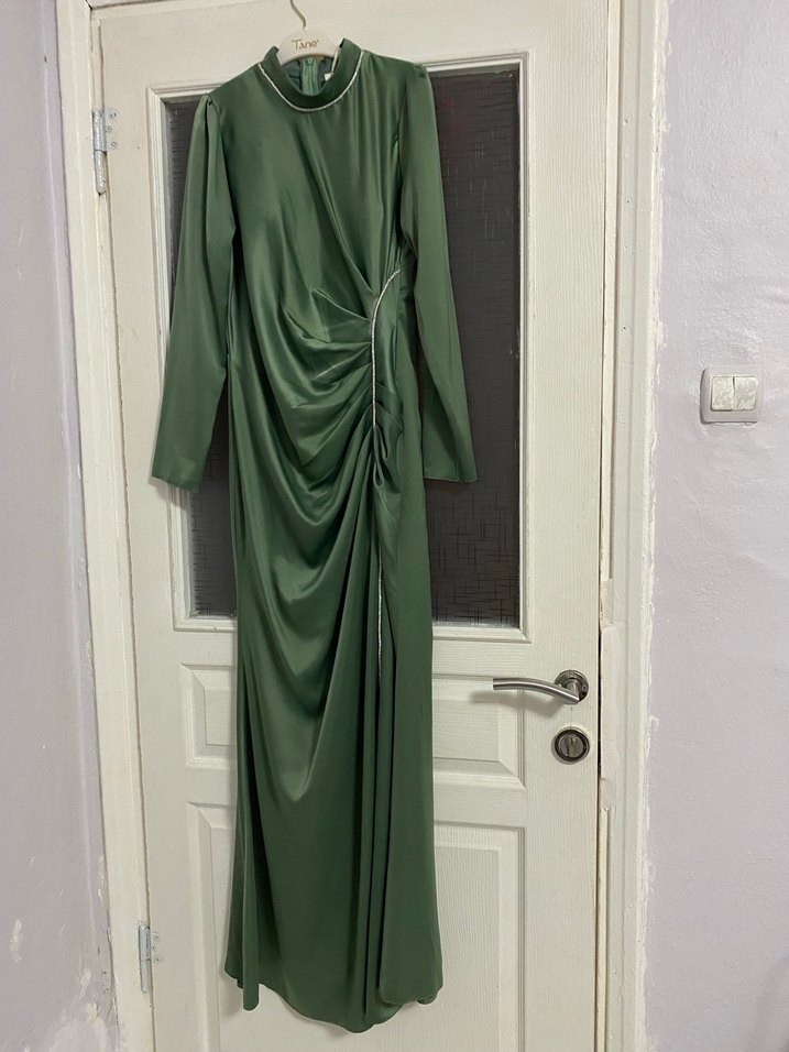 Taş şeritli beli drapeli saten abiye