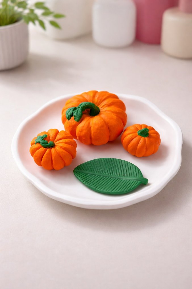 Beyaz tabak üzerinde üç canlı turuncu kabak şeklinde dekor ve yeşil yaprak detaylı set, masa dekoru için uygundur. Ürünümüz verniklidir.