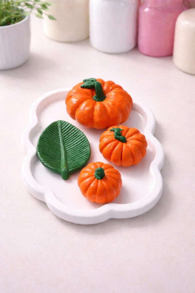 Üç turuncu kabak ve yeşil yaprak figürlü, beyaz tabak üzerinde renkli bir masa ürünü. Ürünümüz verniklidir.