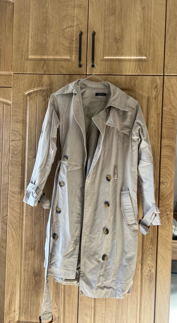 Taş uzun keten trençkot, düğmeli ve kesik yaka detaylıdır. Rahat ve hafif kumaşıyla günlük sokak stiline uygundur.