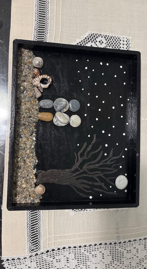 Doğal taşlar ve kabukların kullanıldığı siyah zemin üzerinde küçük beyaz noktalar ve ağaç silueti bulunan dekoratif tablo.