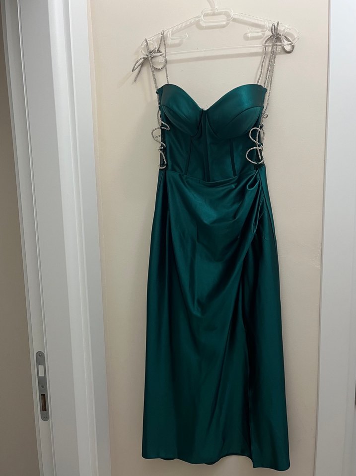 Taş zincir detaylı, straplez yaka ve ince askılı, petrol yeşili midi boy saten abiye elbise. Parlak kumaşıyla davetler için şık ve göz alıcı bir seçenek. Yırtmaç detayı var, yanları korse şeklinde sıkılabilir. Yalnızca bir davette giyildi.