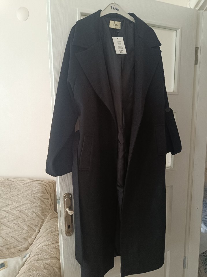 TASA siyah uzun kaban, yumuşak ve sıcak kumaştan olup klasik tasarımı ve ön cepleriyle soğuk havalar için uygundur.
