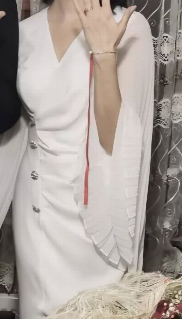 Beyaz kumaştan uzun kollu, drapeli ve yakalı kadın elbisesi. Boyu tam olarak diz kapağına gelmektedir. Düğmeli ve düzenli kesim, düğünler için uygundur. Görselde kilo 57 boy 1.70