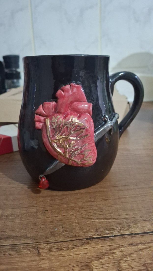 Bordo renginde, kalp figürlü ve metalik bant detaylı seramik kupa, özel bir tasarıma sahiptir. ☕