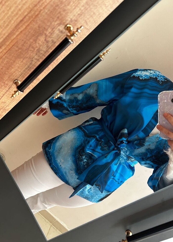 Pamuk saten kimono, kuşağı bağımsızdır, ebruli desenli alacalı mavi renktedir s beden