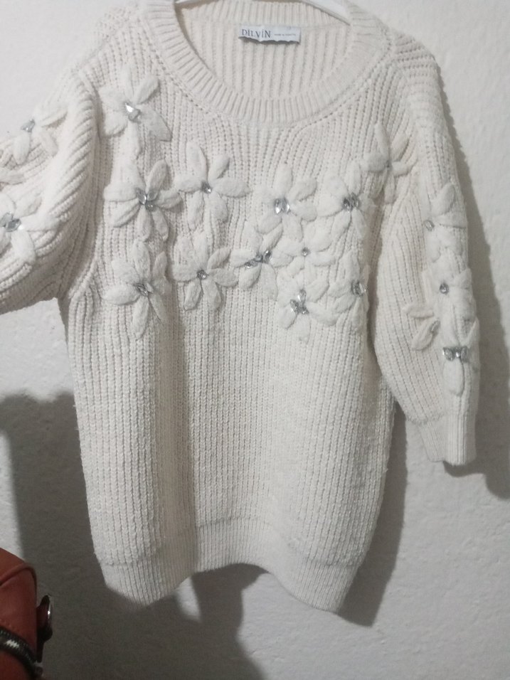 Nakışlı çiçek detayları ve uzun kollu, bol kesim beyaz örgü kazak, günlük kullanıma uygun rahat ve bohem tarz sunar.