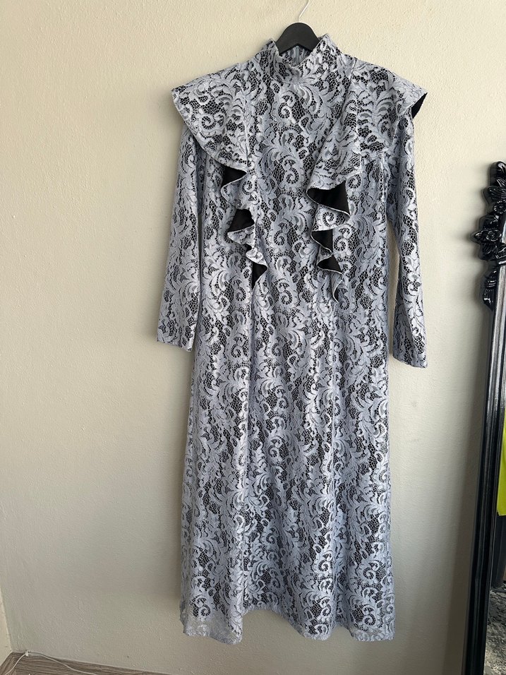 Yüksek yakalı, gri uzun elbise. Uzun kollu ve volan detaylı, bir defa giyildi