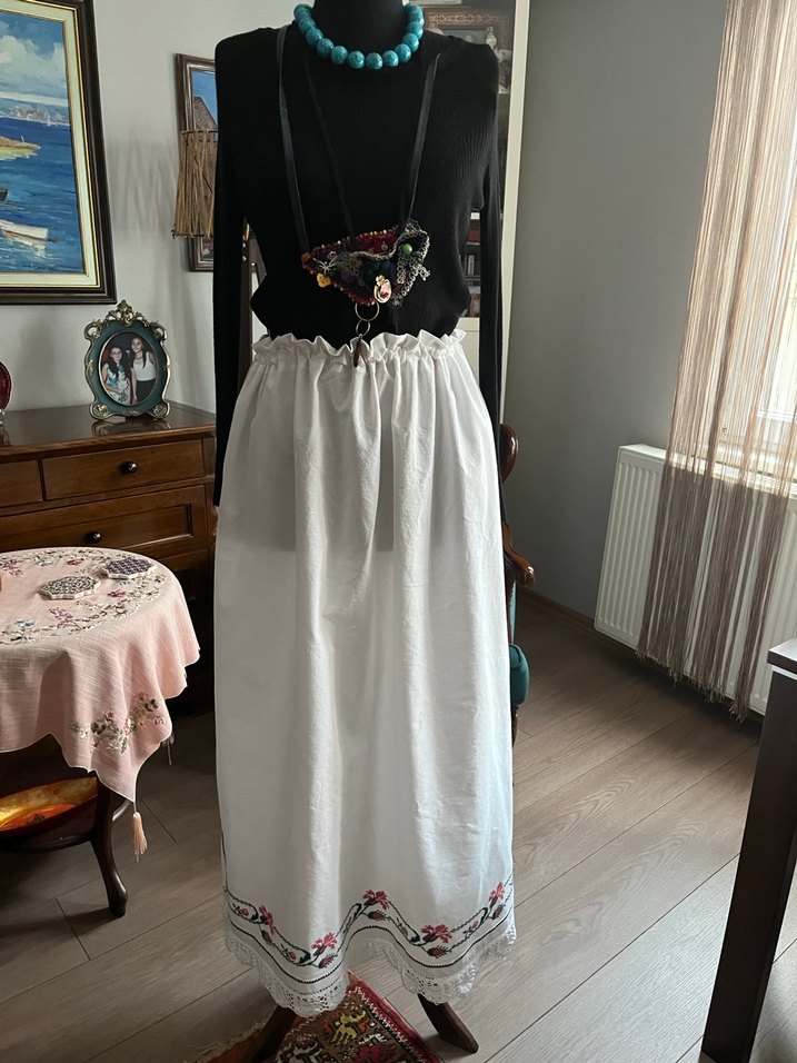 %100 pamuklu kumaş; sandık ürünü bir yatak eteğinden tasarlanmıştır 40/42/44/46 bedene kadar rahat olur beli lastiklidir kanaviçeler işlemesidir #kanaviçeetek #tasarım #etek