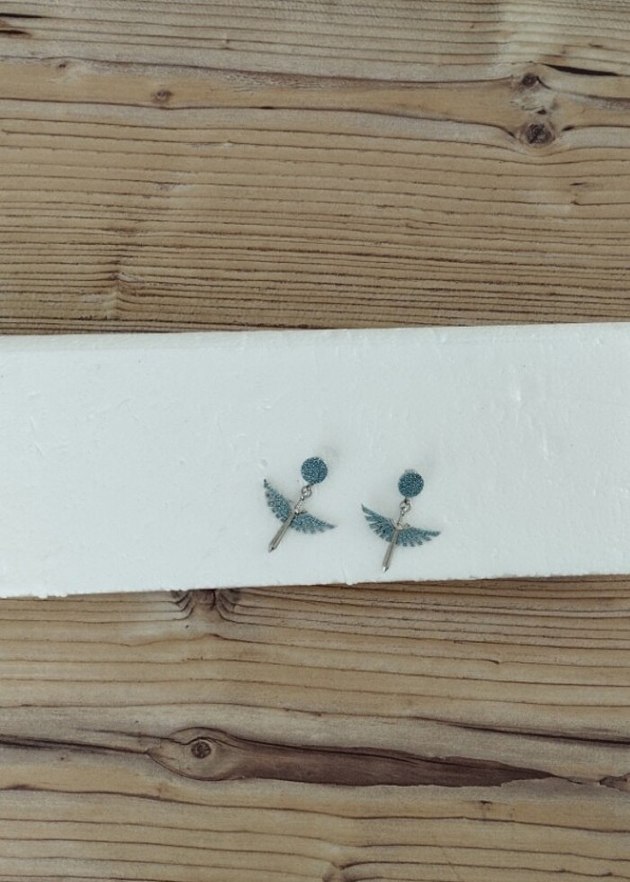 Tasarım küpe. Hediyeydi. Materyalinden emin değilim gümüşse de takma aparatı başka kupede kullanmışım sanırım bilemiyorum. Çelik de olabilir gümüş değilse. Birkaç kez kullanmışım. Yepyeni turkuaz taşlı.