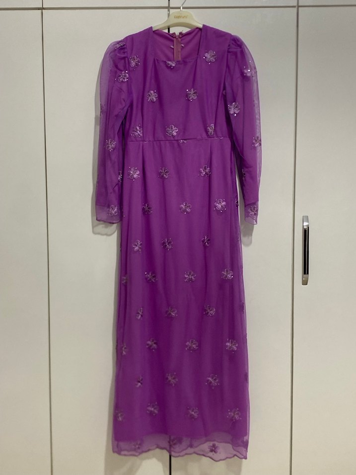 Özel tasarımdır. Sadece 1 defa giyildi. Mor renkte, uzun kollu ve yüksek yakalı bu uzun elbise, boncuk işlemeli ve renkli nakış detaylarıyla bohem tarzda, bol kesimlidir. Düğünler için uygun.