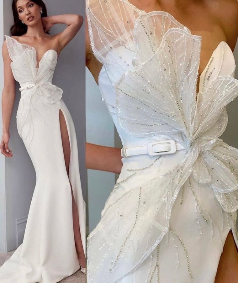Yırtmacı manken fotoğrafı kadar derin değildir istenirse dikilebilir. Tasarımcının gelinliğini birebir dikimidir. İlk iki fotoğraf tasarımcısına ait diğer fotoğraflar bana ait gelinlikte kemer yok. Arkası fermuarlı fermuarın içinde de korsesi var.Bel 33cm göğüs 38 cm göğüsten yere kadar 140 cm ekstra 26 cm kuyruğu var