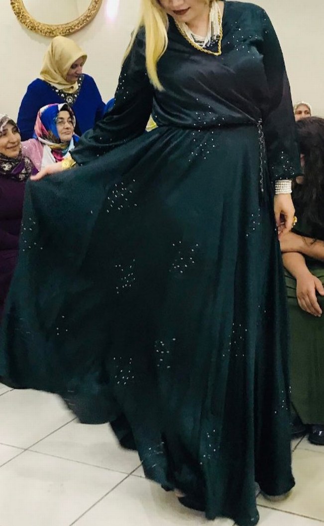 yeşil renkte, drapeli ve tam kiloş kesim uzun abiye elbise. V yaka ve uzun kollu, kolları lastikli.desenli kabartmalı taşlı kumaş.dokusu ile düğün gibi şık etkinliklere uygundur. hafif kuyruklu. çok şık. özel tasarım. modacıya diktirildi.