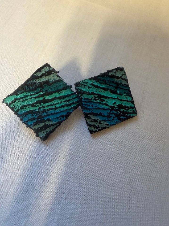 pilili dokulu, koyu turkuaz tie-dye desenli küpeler. Bohem ve modaya uygun tarz için uygundur.