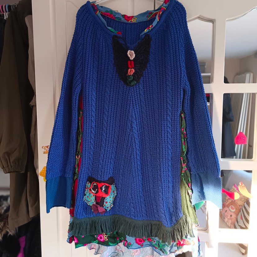 Renkli desenlere ve yuvarlak yakaya sahip uzun, bol kesim örgü elbise Bohem tarzıyla dikkat çeker ve rahat bir yapıya sahiptir. Bir kez giyildi