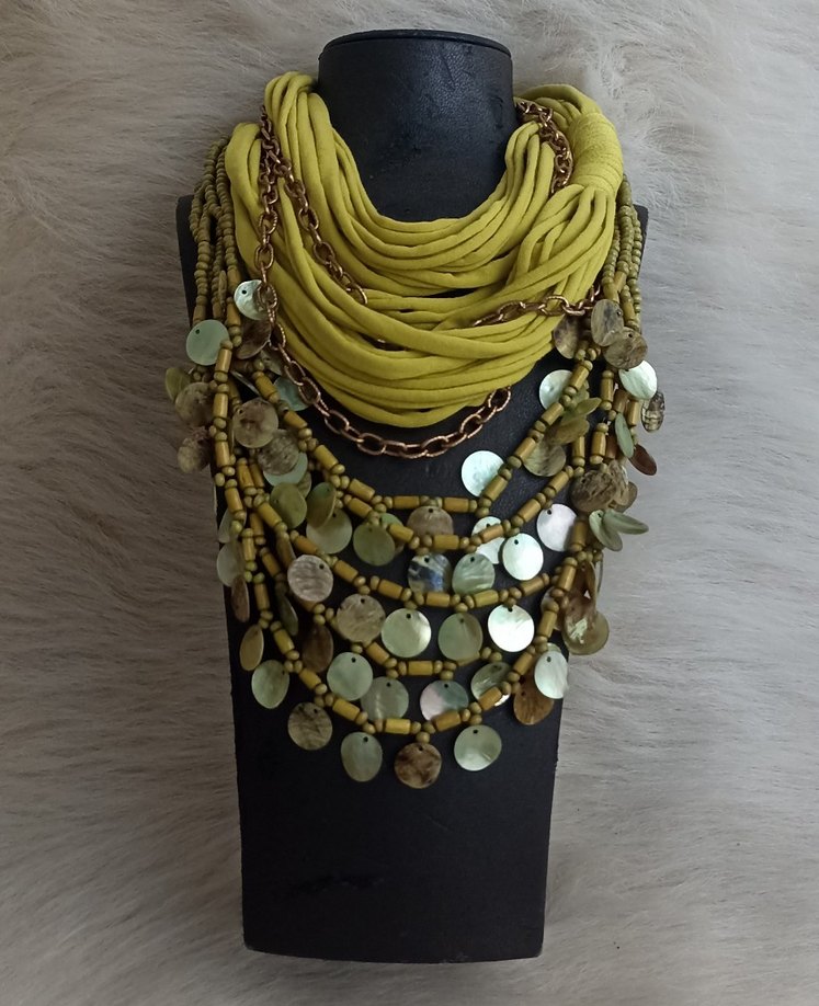 Sedef pullar ve ahşap boncuklar ile kombinlenmiş tasarım kolye. Tek kullanım için zengin bir görünüme sahip olan kolye hertürlü kombinle de farklı kullanıma müsaittir. Penye kolye ayrıca satıştadır. Günlük kullanıma uygundur. Pullu kolye 800 TL., penye kolye 400 TL.