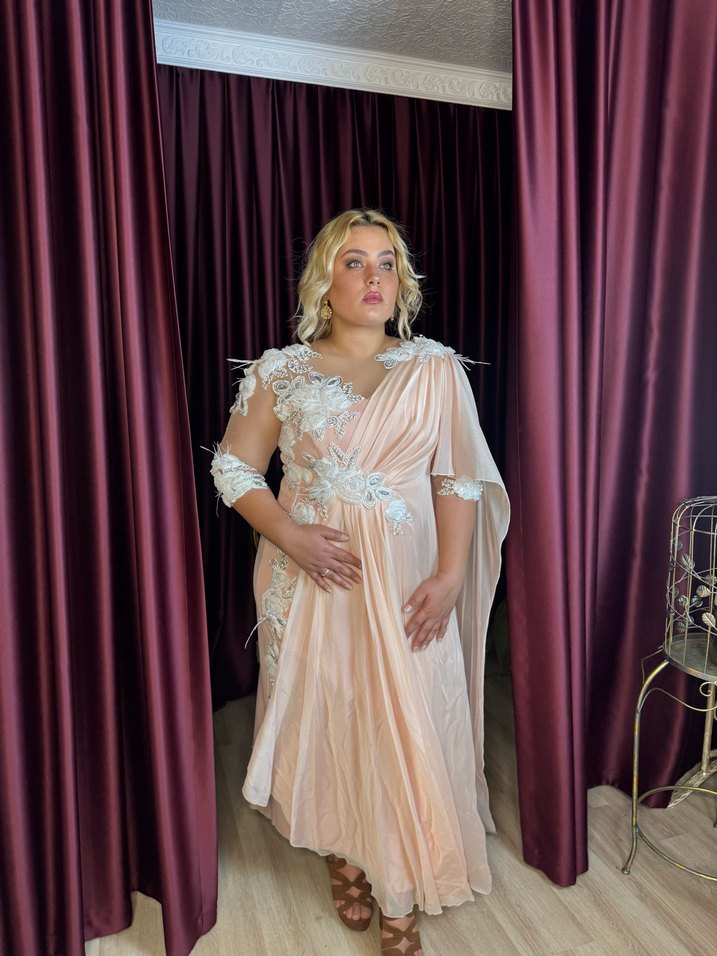 Bohem tasarım, fazlalıkları kapatan özel kalıbıyla 3d çiçek tül kollarda şifon kullanılmıştır. Mağazada yer açmak için zararına satıştadır. Manken boy 173 kilo 95