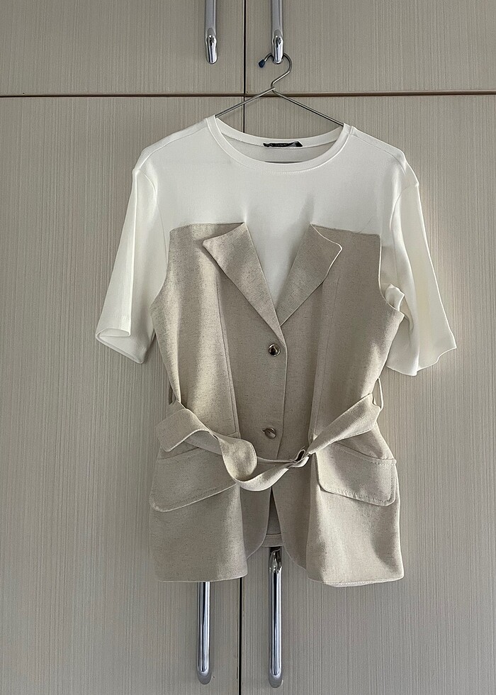 Tshirt yelek görünümünde tek parça kemerli tasarım hiç giyilmedi Nişantaşı Butikten alındı S-M beden uyumludur