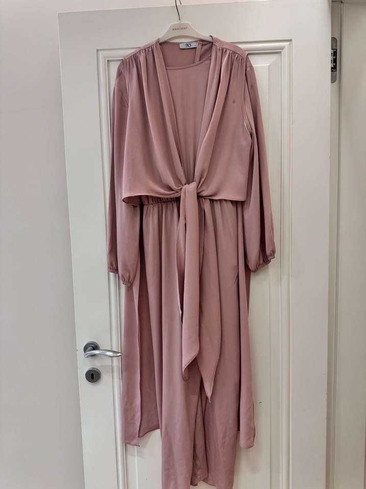 Omzunda lekesi bulunmaktadır 1 bedendir.Uzun, bol kesim tulum üzeri yelek , drapeli ipeksi kumaş, yakası kesikli, askılı kollu, ofis için uygun. Pastel pudra rengi modern klasik dokunuş sağlar.