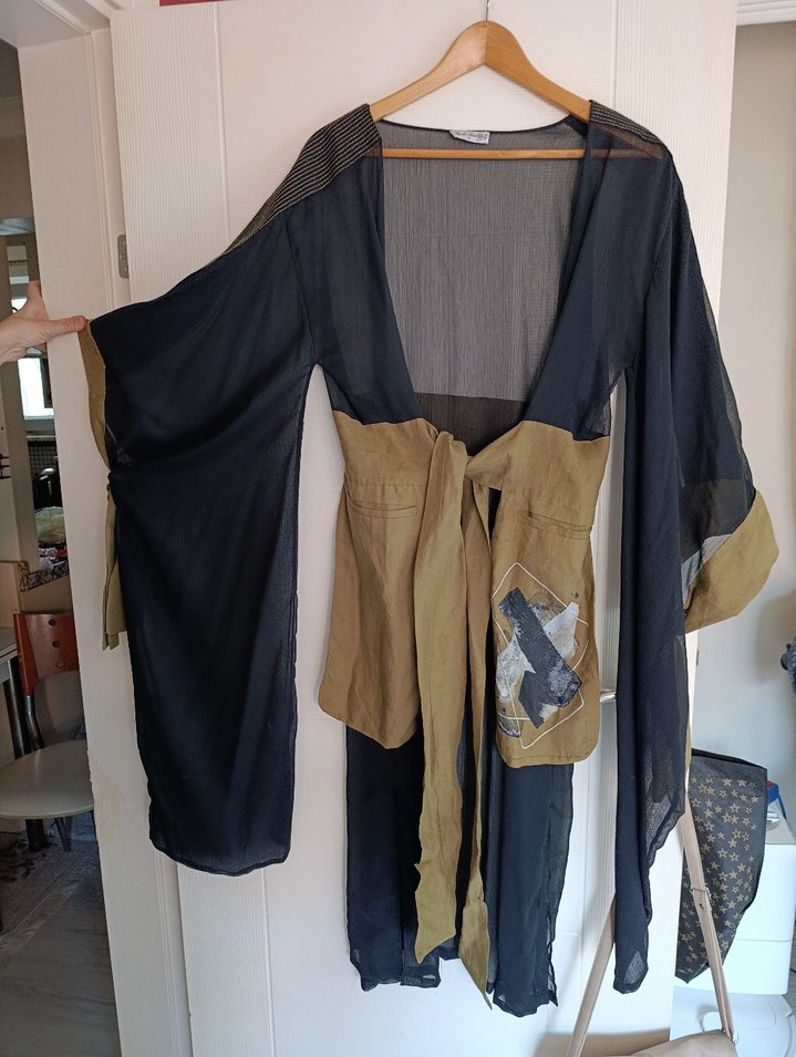 Krep şifon üründür. Kol detaylı Japon kimono modeli. 42 48 beden uyumlu. Sadece 1 kere kullanıldı. Boy 118 cm Bel 49 cm