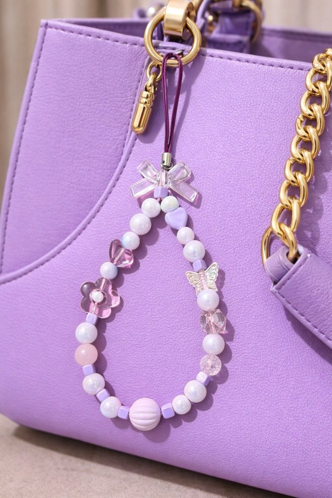 Pastel mor tonlarında, çiçek ve kelebek detaylı boncuklu bohem telefon ve çanta charmı