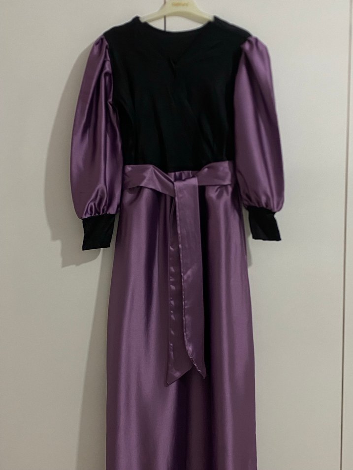 Tasarımdır 1 defa giyildi. Bol kesim, uzun mor elbise, ipeksi dokulu, uzun kollu ve yuvarlak yakalıdır. Kemerli ve gotik tarzda düğünler için uygundur.