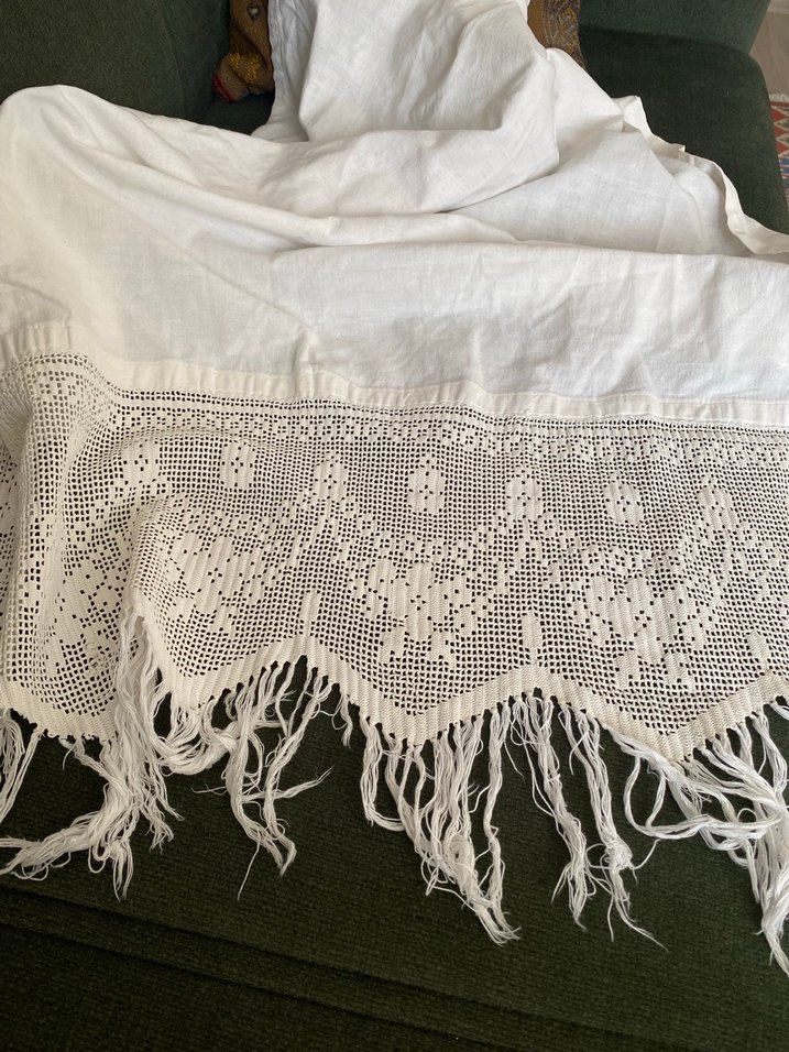 Eskilerden kullanilmis cuvalimsi bir kumas delik var…danteli ince pamuklu eni 74 cm…puskul haric dantel genisligi 24 cm…dantelde de defo var fotoda mevcut…defolardan dolayi uyguna koyuyorum