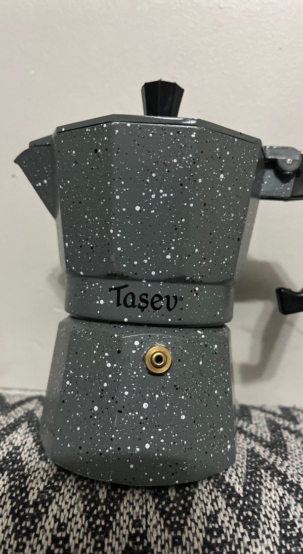 Tasev'in gri desenli çaydanlığı, klasik tasarımı ve sağlam sapıyla kolay kullanım sağlar. Çay demlemek için uygundur.