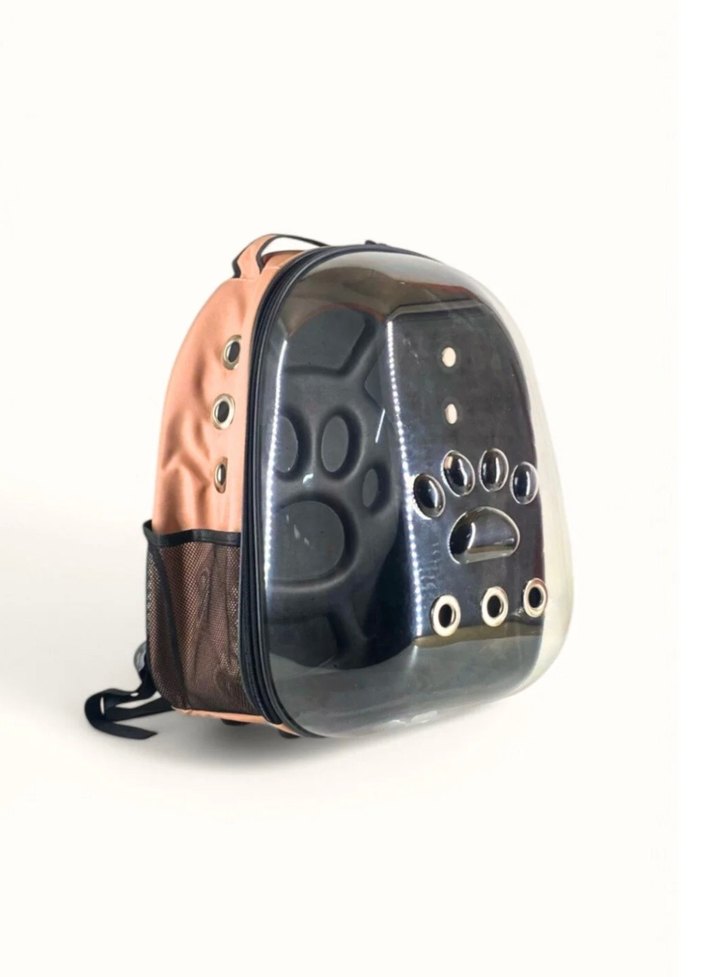 Şeffaf ön yüzey ve havalandırma delikleri bulunan evcil hayvan sırt çantası, konforlu ve güvenli taşıma sağlar.