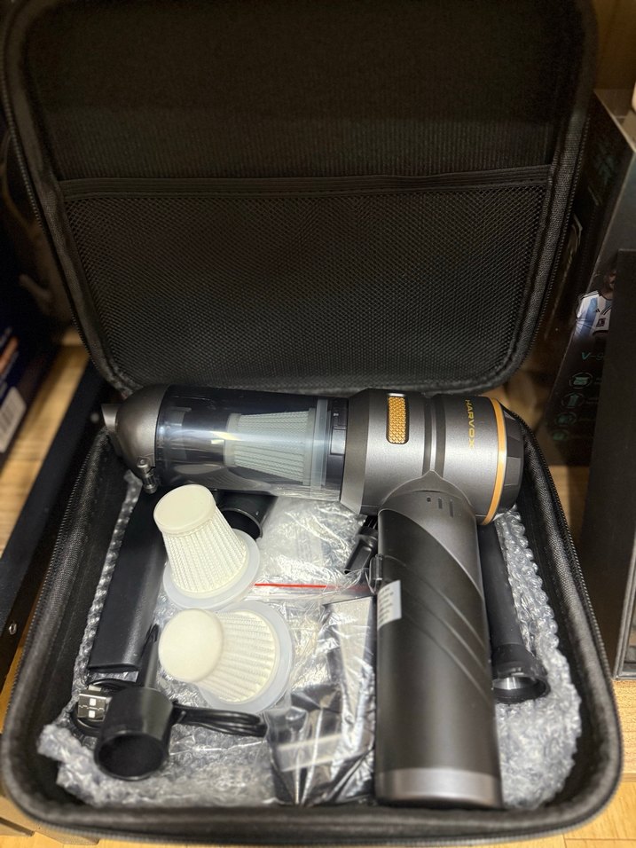 Taşınabilir, kablosuz, koyu bej renkte elektrikli süpürge seti, çeşitli filtre ve aksesuarlarla birlikte kompakt taşıma çantasında.