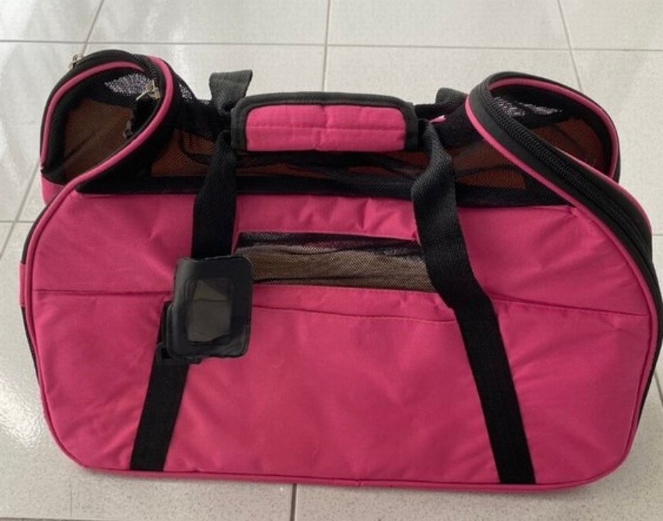 45X35X25 Koyu pembe renkte, hava alabilen file panelleri ve sağlam tutma kolları bulunan taşınabilir evcil hayvan taşıma çantasıdır.