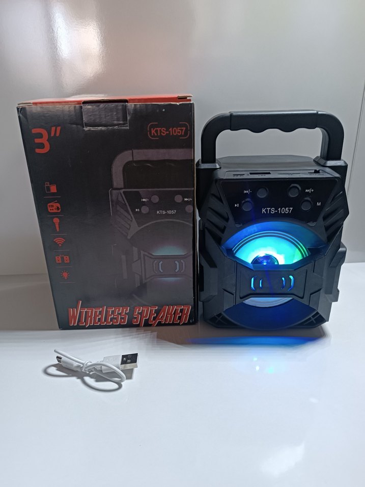KTS-1057 model taşınabilir Bluetooth speaker, renkli ışık efekti ve kolay taşınabilir sap tasarımı ile gelir. USB kablo dahildir.
