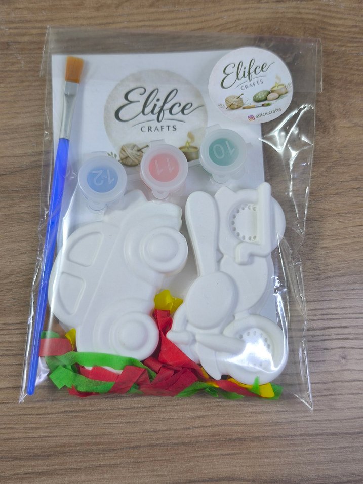 Boyama seti, pastel renklerde boyalar, fırça ve beyaz taş tozu figürler içerir.