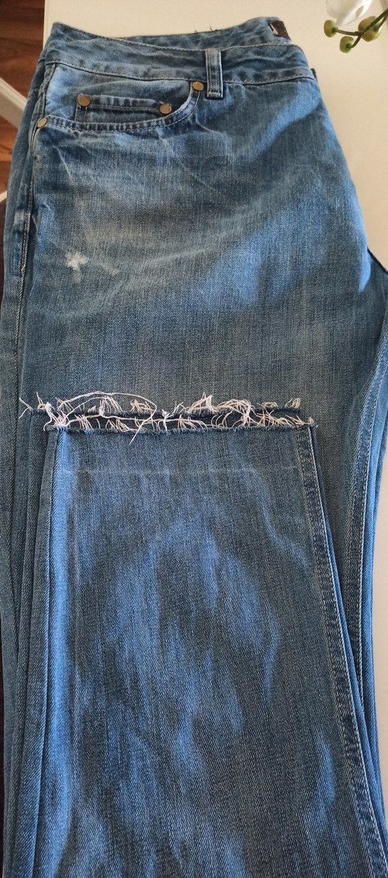 Paça orijinal kısmı yok terzi atmış kesik fotoğrafta görüldüğü gibi püsküllü kot pantolon. Bel 52 cm- Boy 103 cm. Kot sıze 38/34 Düğmeli.. gündelik stil için uygundur.